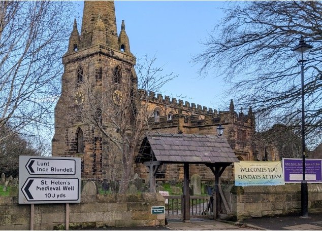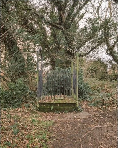 Leaving the grounds, we arrive back at the car park, where glancing across the road, I see a clearing. Maybe no more than twenty steps away from where we started our liminal odyssey, there is a wrought iron structure with wording on it. ‘St. Helen Well’.